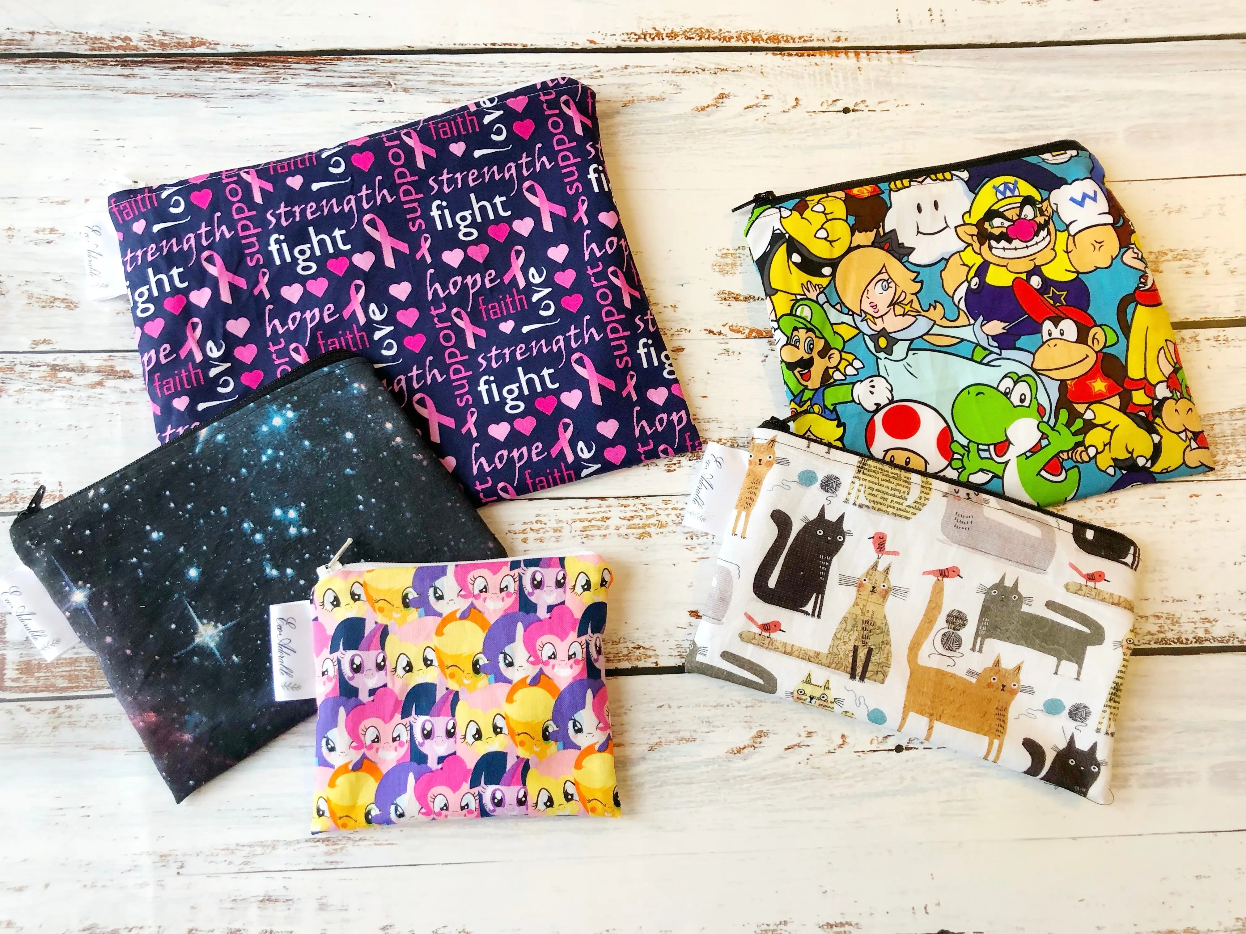 Cette fiche-produit est pour un sac imperméable totalement personnalisé, avec fermeture éclair. Plusieurs tailles disponibles. Ils sont parfaits pour les produits d’hygiène réutilisables, les compresses d’allaitement, les collations, les petits trésors d’enfant, comme porte-monnaie, etc…