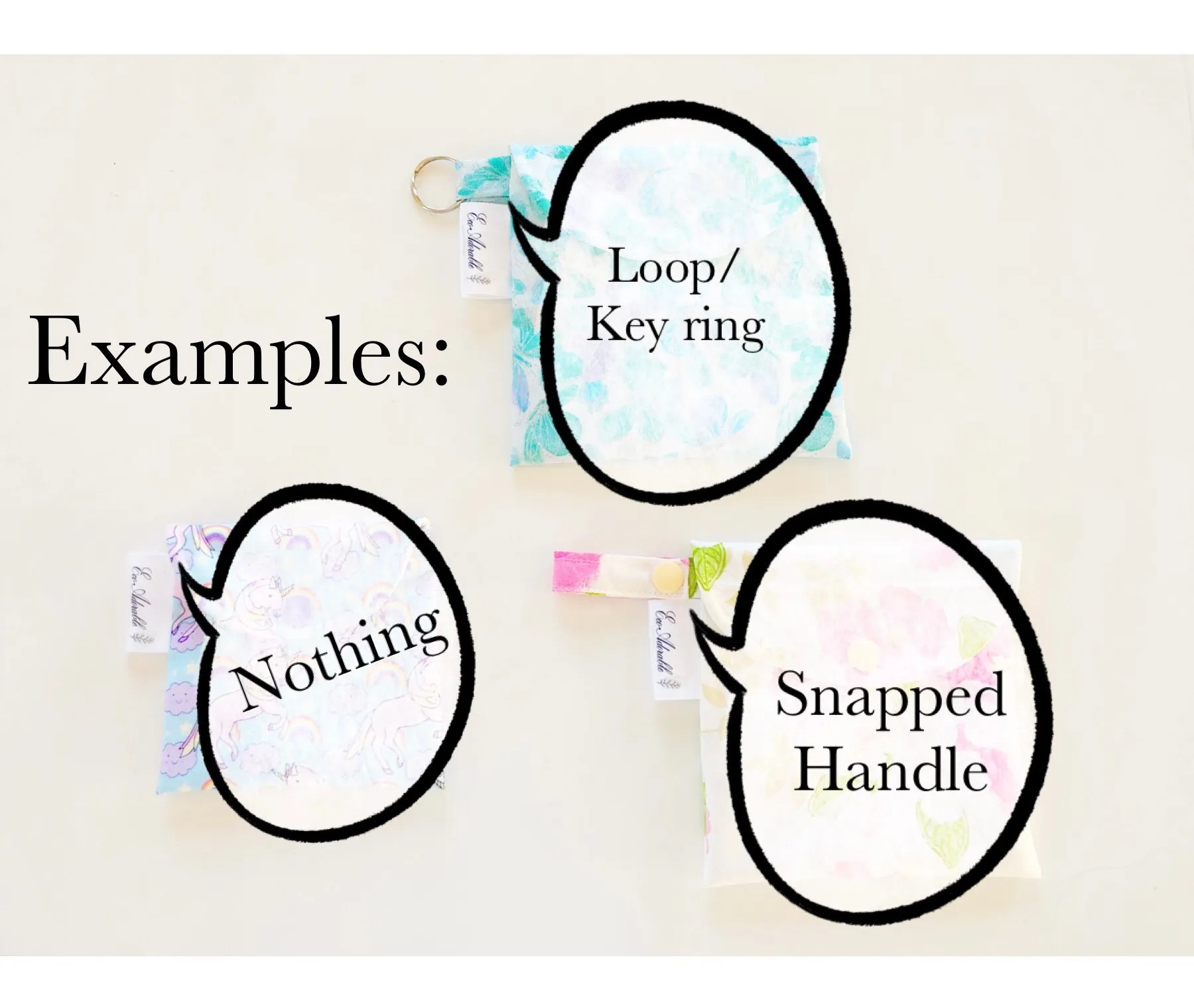 Le sac a un tissu intérieur imperméable en PUL de grade alimentaire (la couleur peut varier), et un tissu en coton à l’extérieur. Vous pouvez y ajouter une languette avec snap( Snapped handle), une boucle porte-clé (loop + keyring) ou rien du tout. (L’étiquette de la compagnie sera présente sur le sac, peu importe l’option choisie)